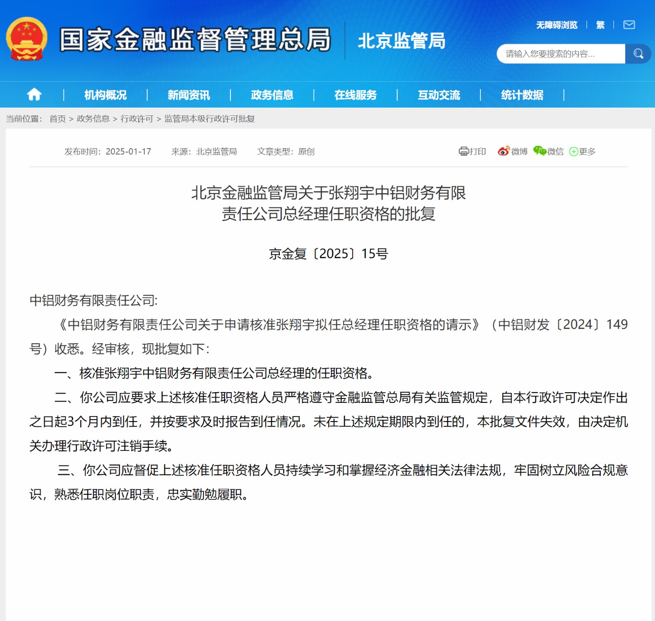 中国网财经1月20日讯日前,北京金融监管局公布相关批复,核准张翔宇中铝财务有限责任公司(简称“中铝财务公司”)总经理的任职资格。以下是相关批复正文: